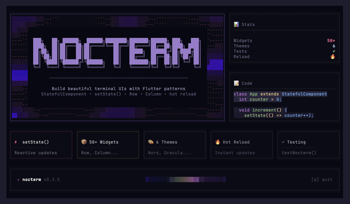 Nocterm est un puissant framework d’interface utilisateur terminal inspiré de Flutter pour créer de belles applications en ligne de commande en Dart. Il permet aux développeurs de créer des applications terminal riches et interactives en utilisant des patterns Flutter familiers comme StatefulComponent, setState(), Column, Row, et bien plus encore.